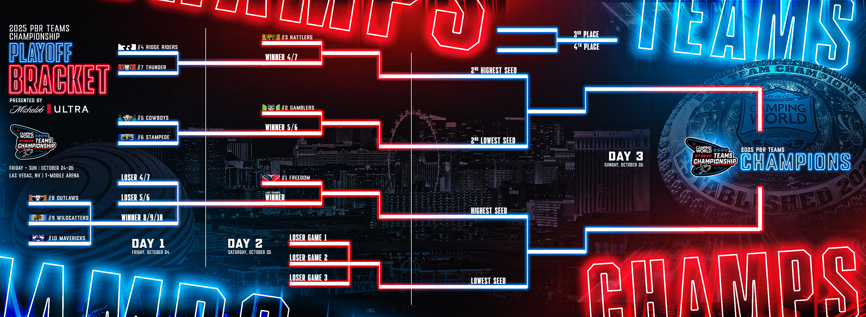 After 12 weeks of team competition, it all comes down to the Championship. The 2025 season culminates with the PBR Teams Championship. The action starts on night one where the field of 10 teams will be cut down to eight. Those eight teams will then compete for three more nights at T-Mobile Arena for the buckle. And the title of Teams Champion 2025.